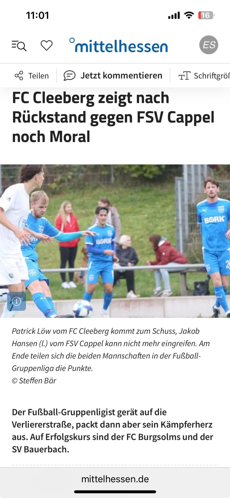 Zwei Konter führten jeweils für die Cleeberger Führung. Batuhan Yesil erzielte in Hälfte Eins das 1-0 und nach dem zwischenzeitlichen Ausgleich der Gäste, konnte der eingewechselte A-Junior Felix Mohr zur 2-1 Führung treffen (86te). Leider fing man sich in der Nachspielzeit noch den unglücklichen, aber hochverdienten Ausgleich. Trotzdem Respekt an die Truppe, die auf zahlreiche Leistungsträger (Basti Beiden, „Garten“ Seidel, Witali Bertram und Yannick Diebel (verletzt nach 10 Minuten) und noch einige andere) verzichten musste.
